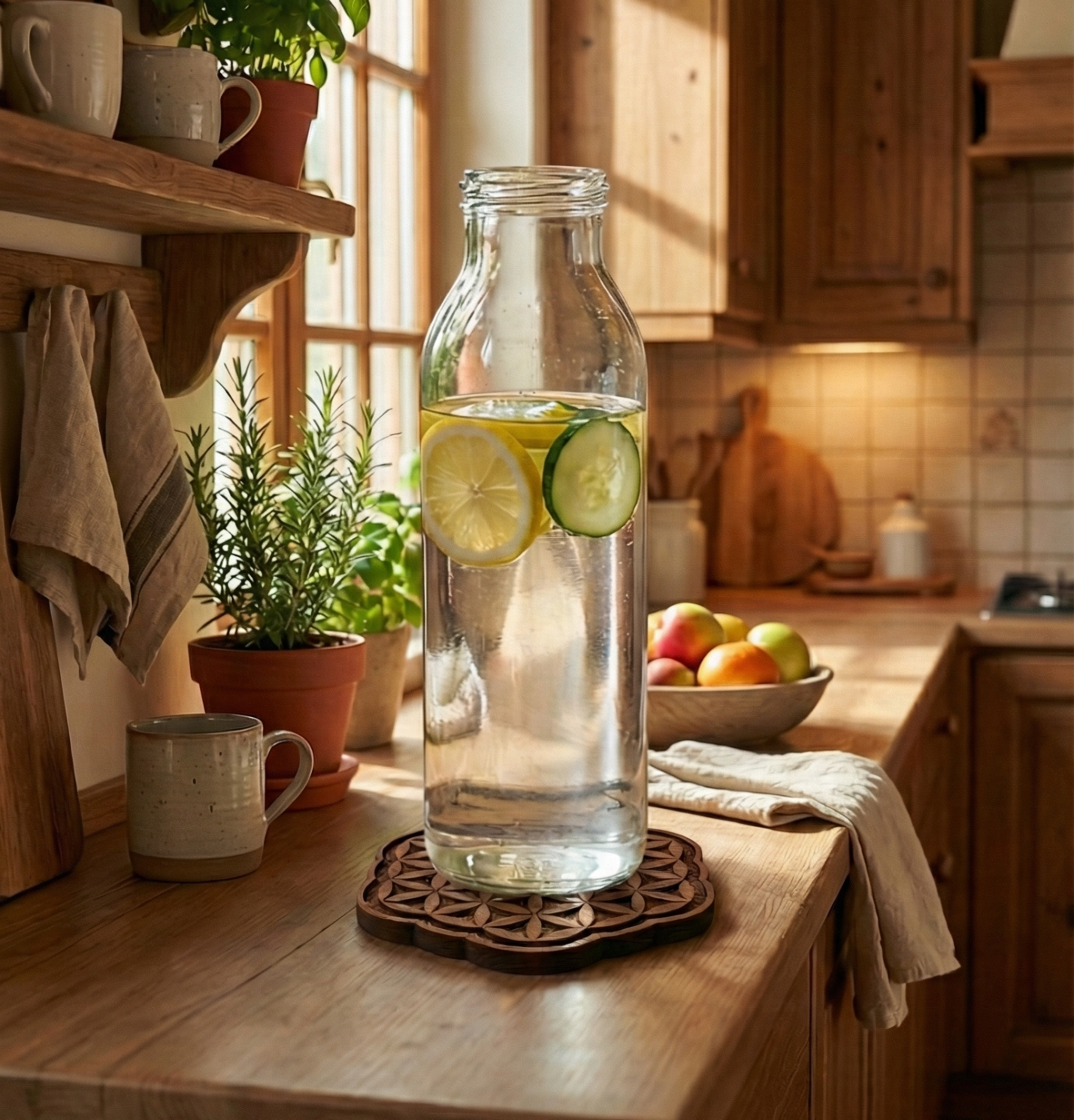 - Vitalité : Placez votre verre d’eau, votre gourde ou vos compléments alimentaires pour en dynamiser les propriétés.